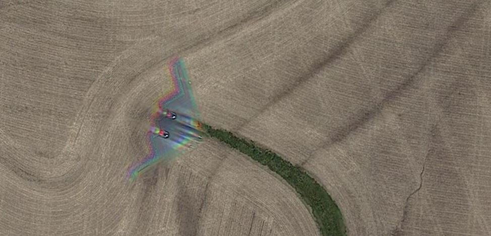 The B-2 Spirit Bomber can fly at 1,010 km/h (or about 628mph), this image of the bomber was still captured on Google Maps as it was flying across Missouri. This image was found by Redditor Hippowned. The image is slightly blurry and has some red, green, and blue artifacts. It’s because of the way satellites capture images. Google Maps, and Google Earth, gather their images from many sources, but this frame was collected by satellite imagery from Maxar Technologies.